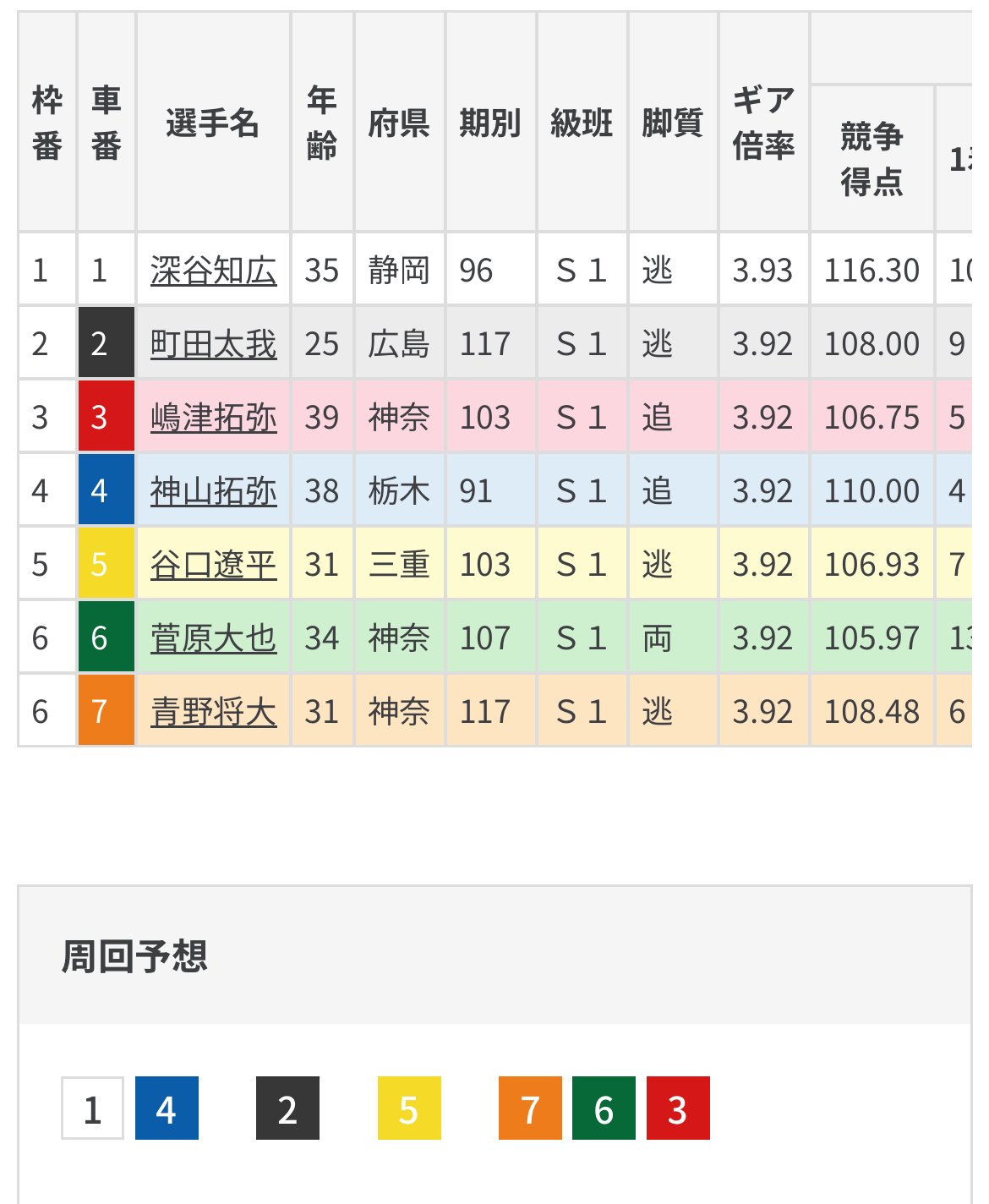 深谷の後ろは神山拓弥であるしサッと引いて捲り勝負に持ち込み最終的には後方から一気の捲りで前団を捉えてくるのは必須だろう。