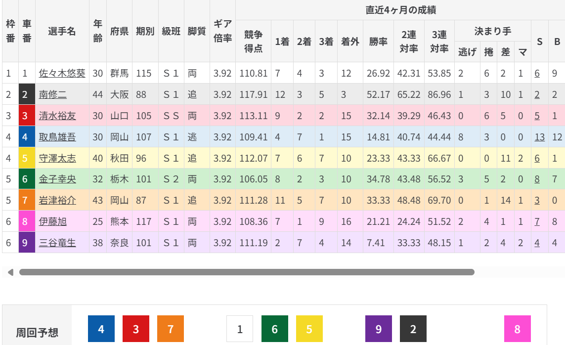 逆に⑨三谷が中団で、先行意欲のある①佐々木が④取鳥とやり合う形になった場合。