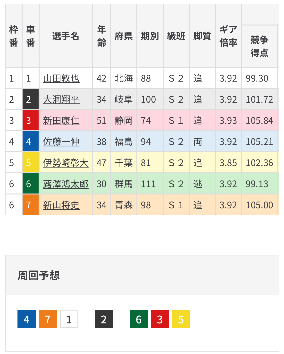初日後方ひと捲りと好調の佐藤一伸は申し分ないが地元新山は落車欠場明けでまだまだ本調子とはいえずで人気としては不確定要素が多い。