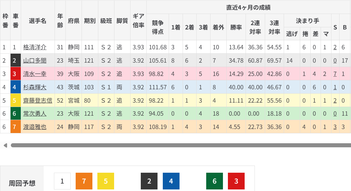 2人ともB回数は10回あるが、捲りの決まり手はない。