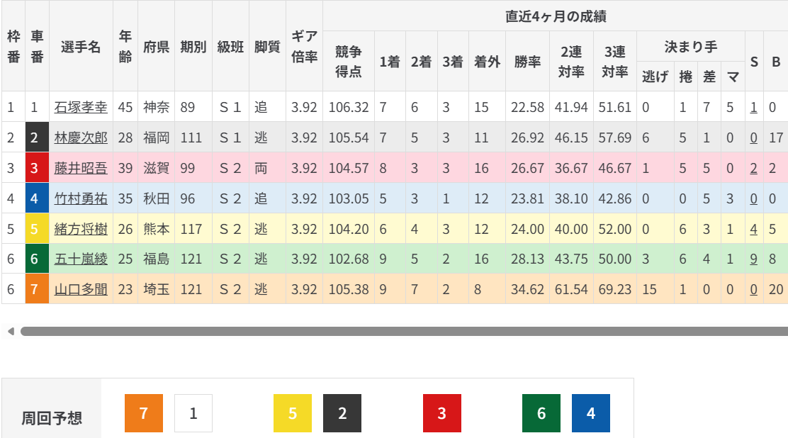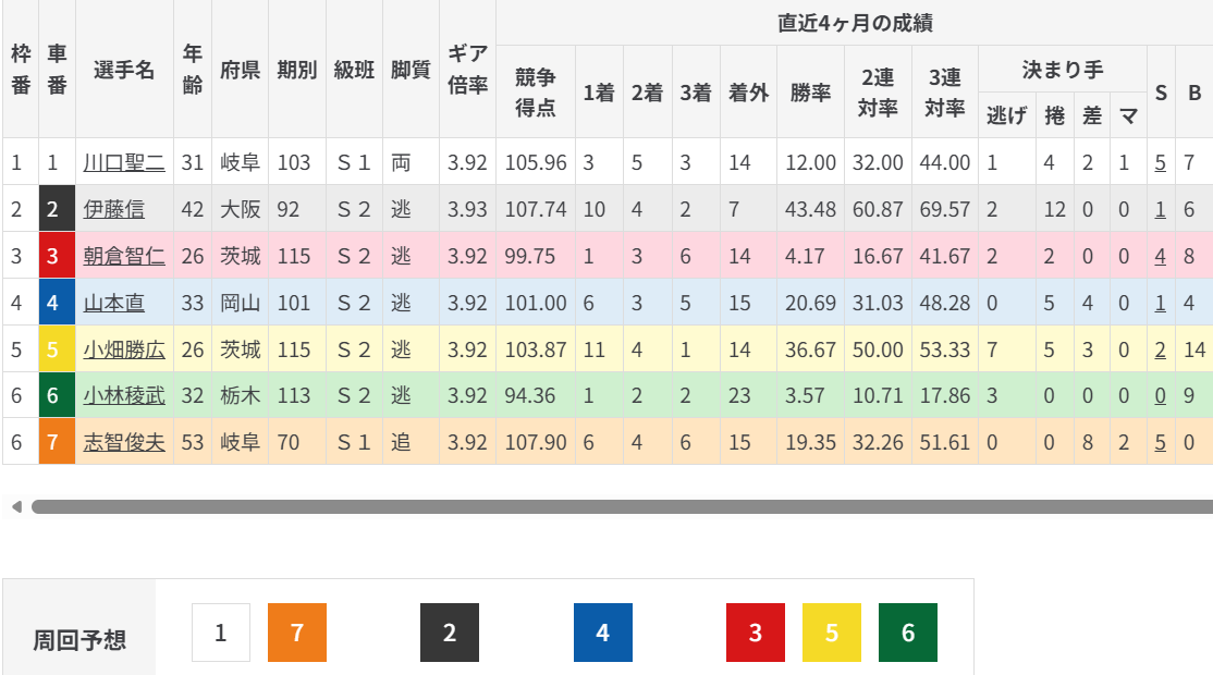 このメンバーであれば⑦山口の逃げに絞って狙っていいはず。