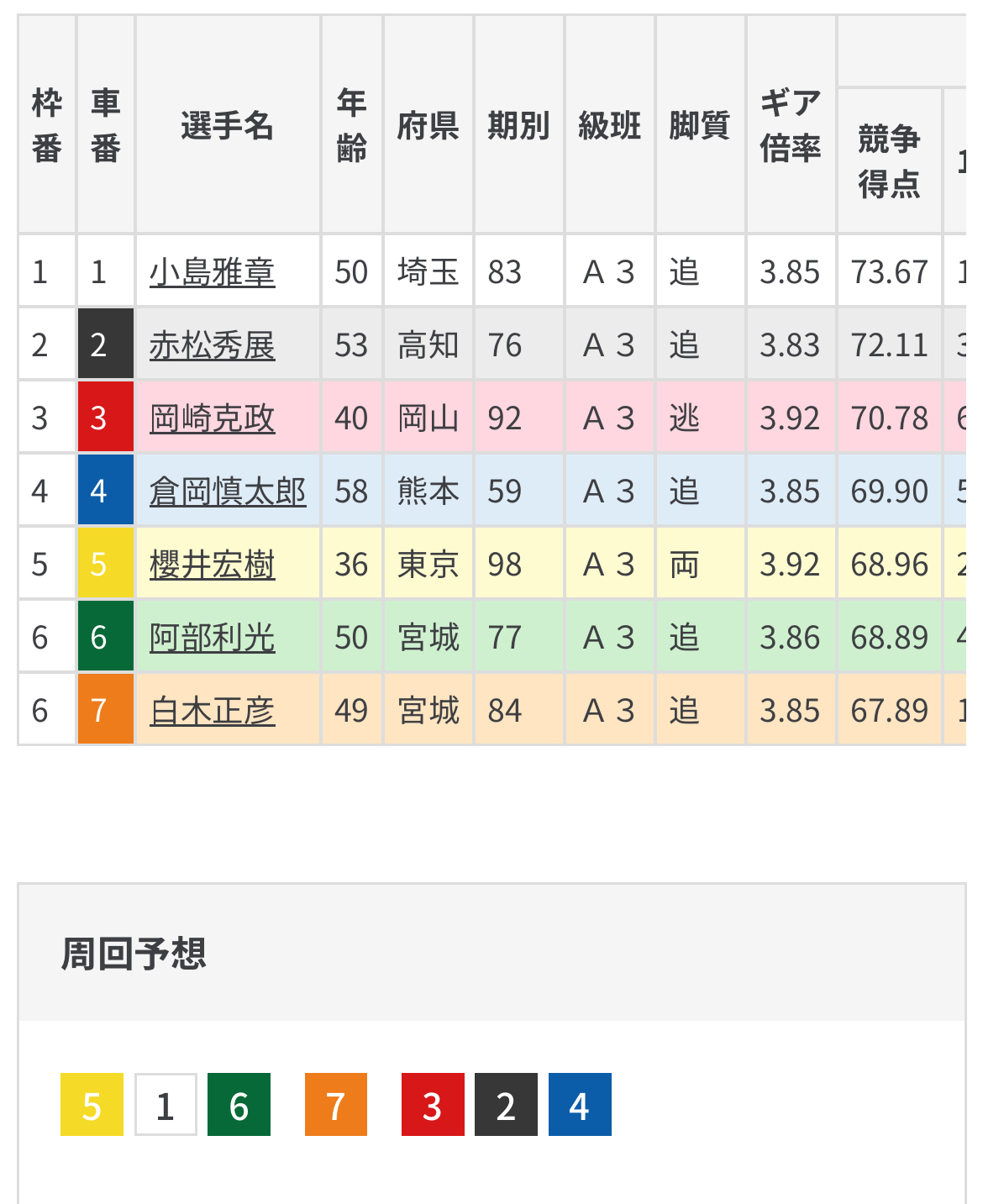 捲りに回れば弱い岡崎だけに小島の介護を期待してのぶん回しや岡崎の番手飛びつき狙いで前々踏むことになりそう。