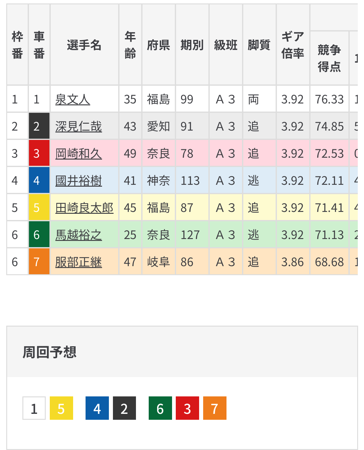 逃げたら逃げたで押し切る馬越に昨日は後方になり迷惑かけた田崎に戦歴上位の泉が番手戦に名乗りをあげる展開もあり。
