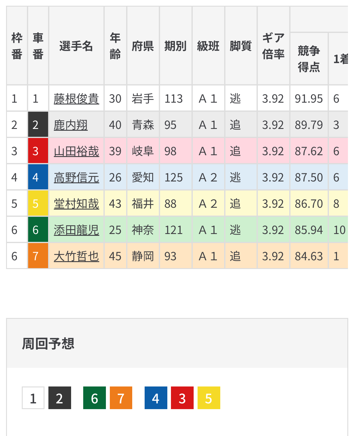 準決勝が一つの壁になっているが今日の縦脚が怪しい藤根、後ろ攻めの添田相手なら一発捲っての勝機見える高野を本線におく。