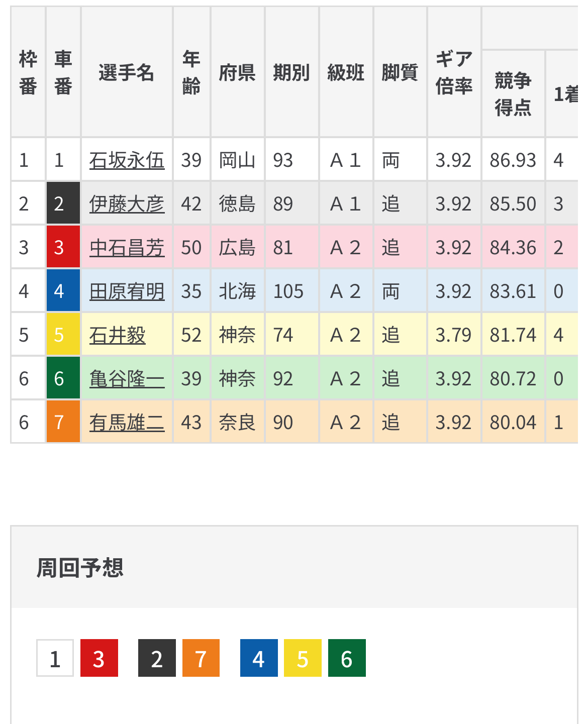 番手の石井は点数こそ低いが負け戦で決まり手を稼いでおりココは信頼を置いて本命にする。