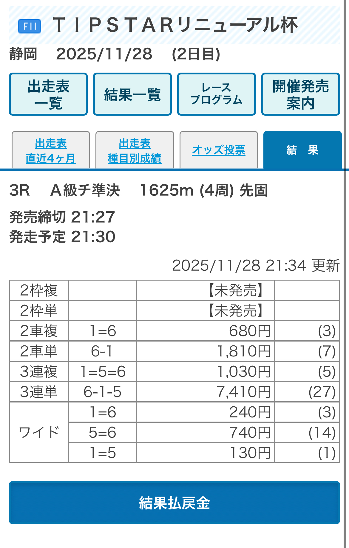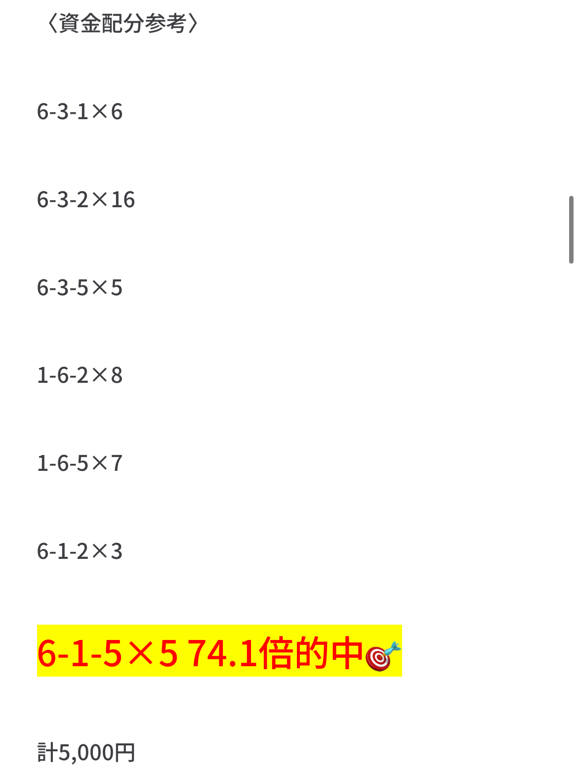 昨日は静岡3R「6-1-5」71.4倍×5を的中しました!