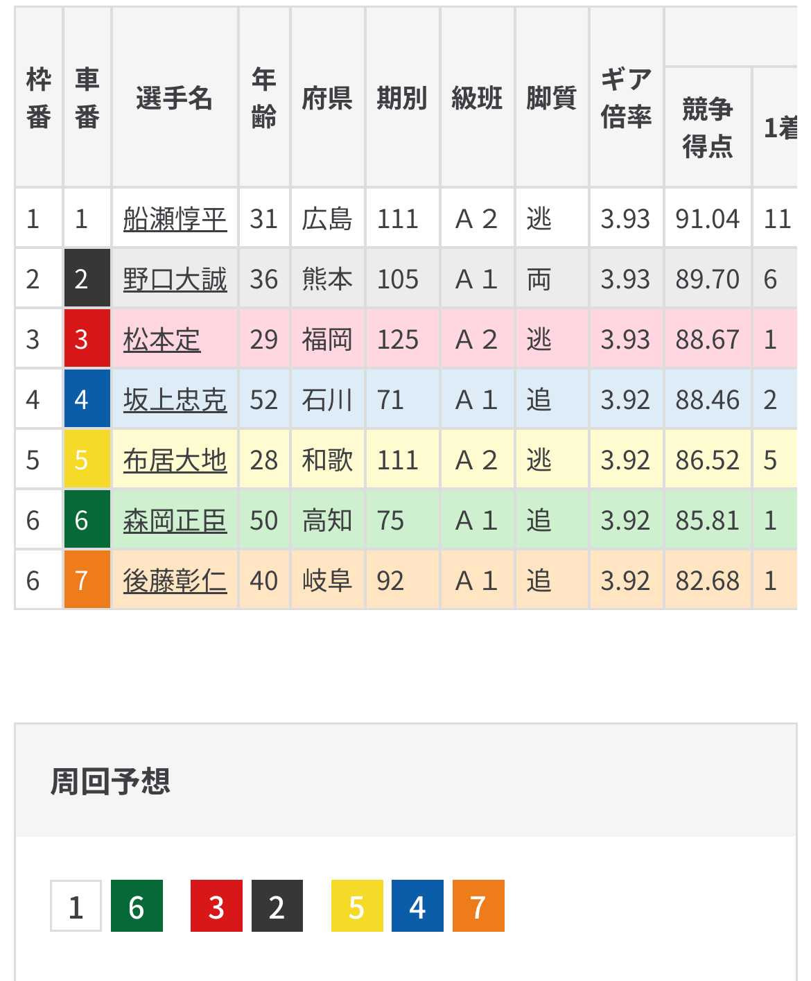 松本と船瀬が牽制しあえば中団を確保できる、しかも布居は唯一の3車ラインという強みもあり脚を溜められる布居から狙いたい。