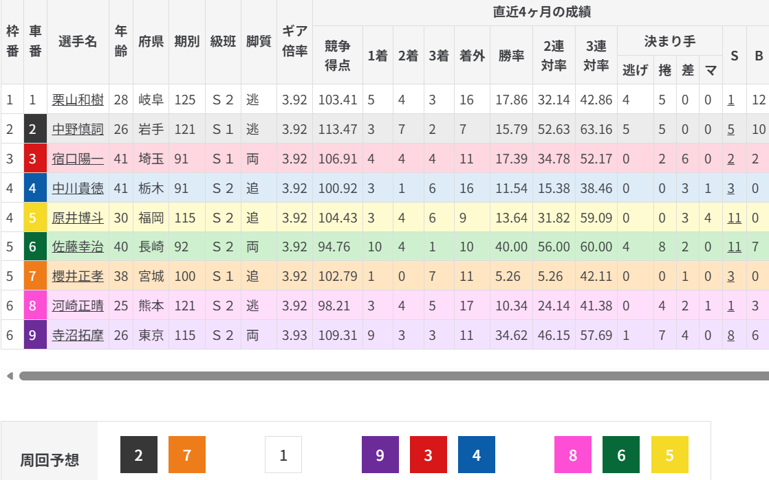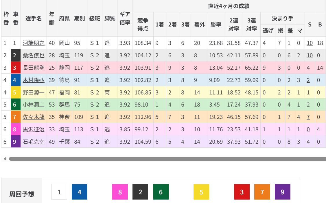 相手は積極型ではないが、3車で地元の元SSを背負えば逃げる可能性もある⑨寺沼と、絶好調⑥佐藤を背負っての⑧河崎となればどちらかの先行に。