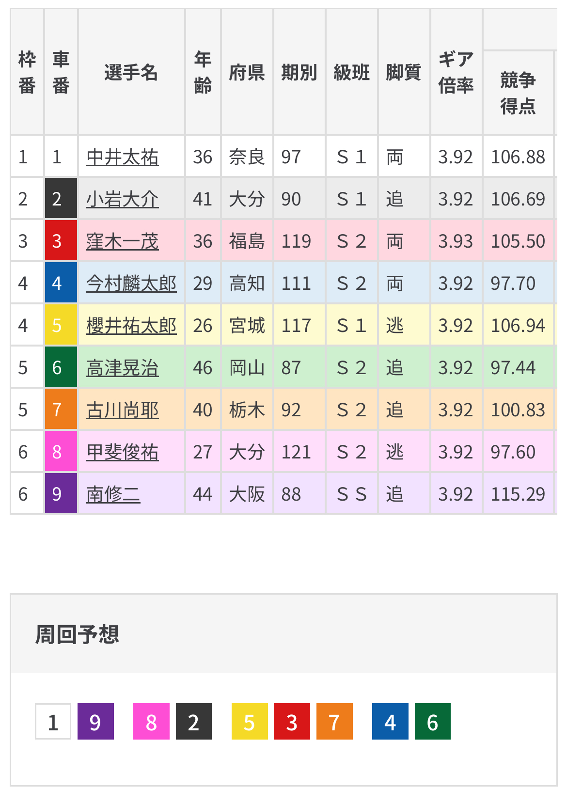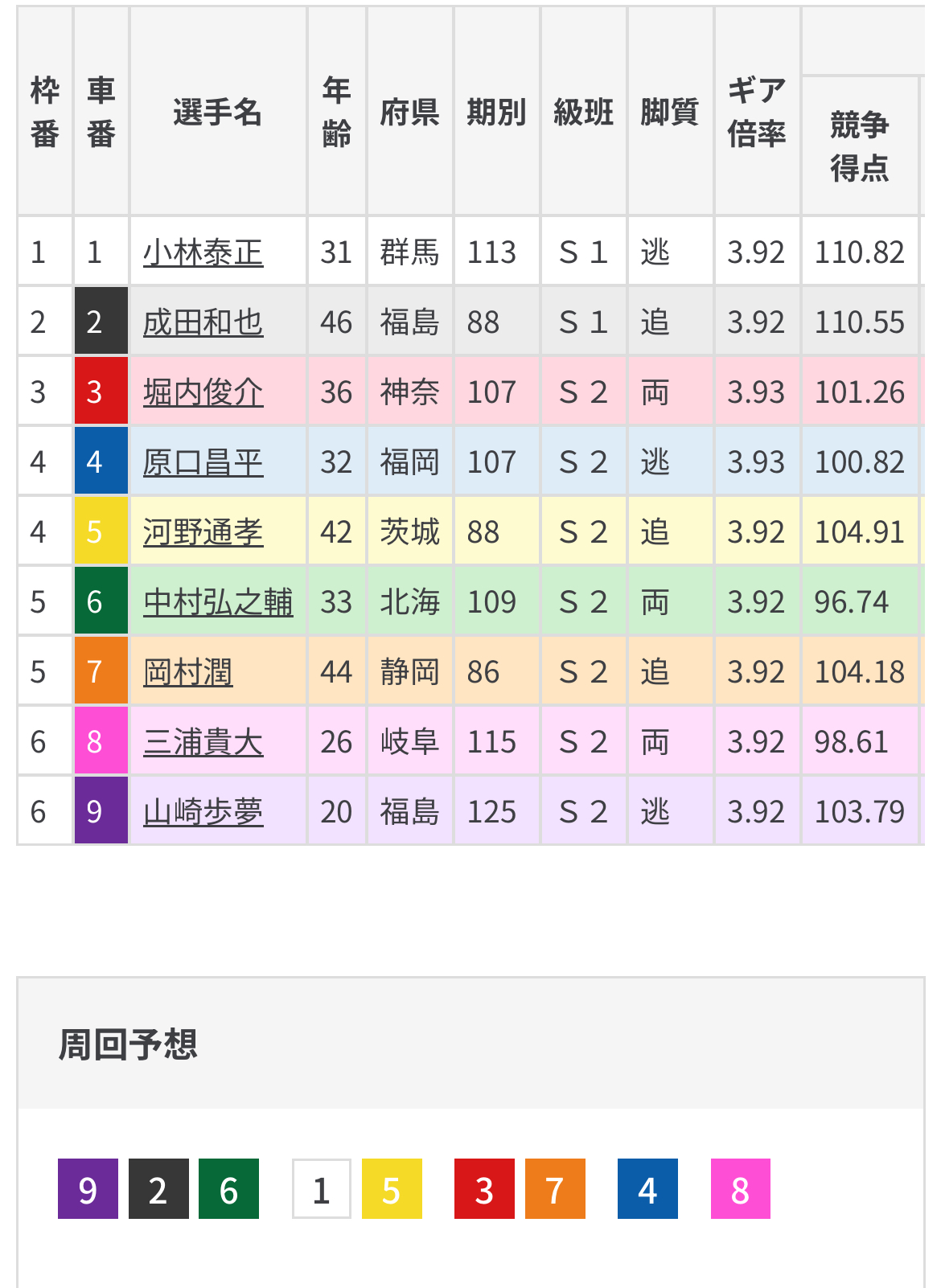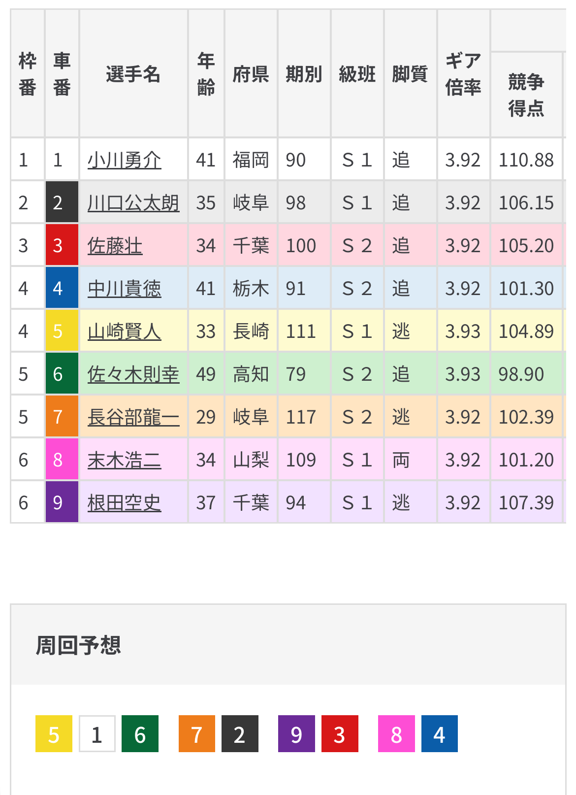 小川が1番車と好枠で前受けからロングの仕掛けで小川とのゴール前勝負になりそう。