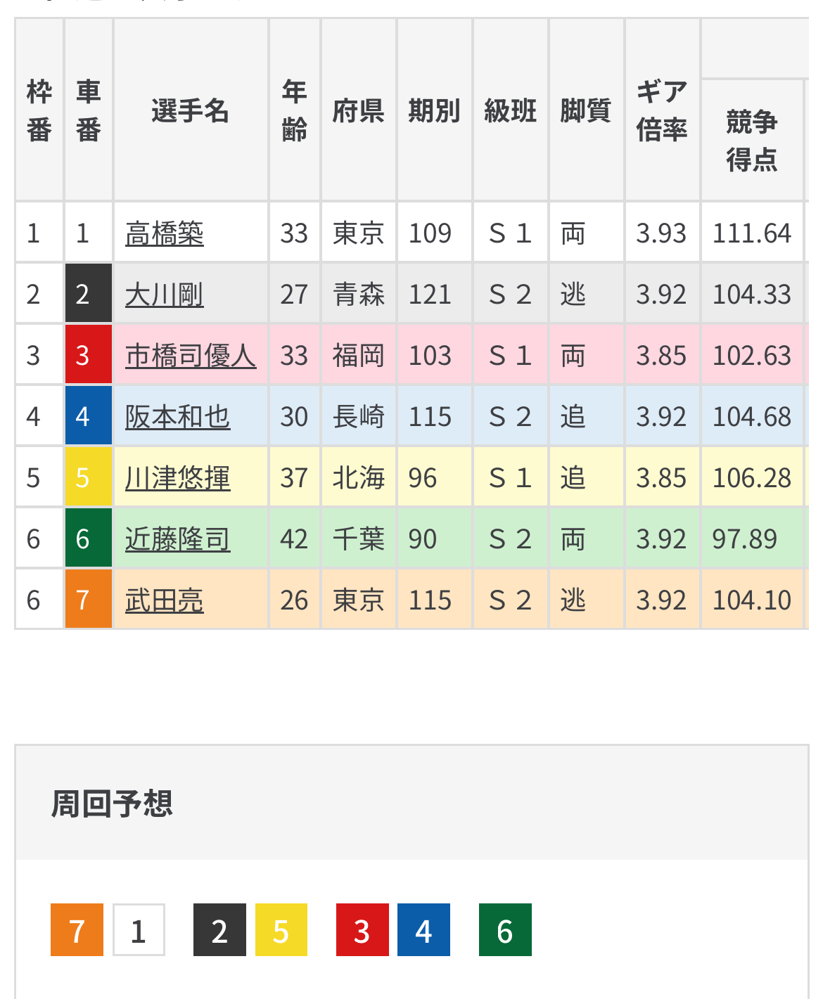 大川は引いてカマシも市橋に逃げはなく6番手からのカマシ捲りになり武田がうまくペースを作れば大川の巻き返しは厳しく