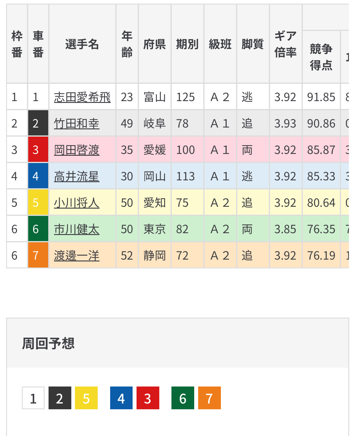 S早い岡田、市川のとちらかが前を取りそうで志田は引いてカマシになりそう。