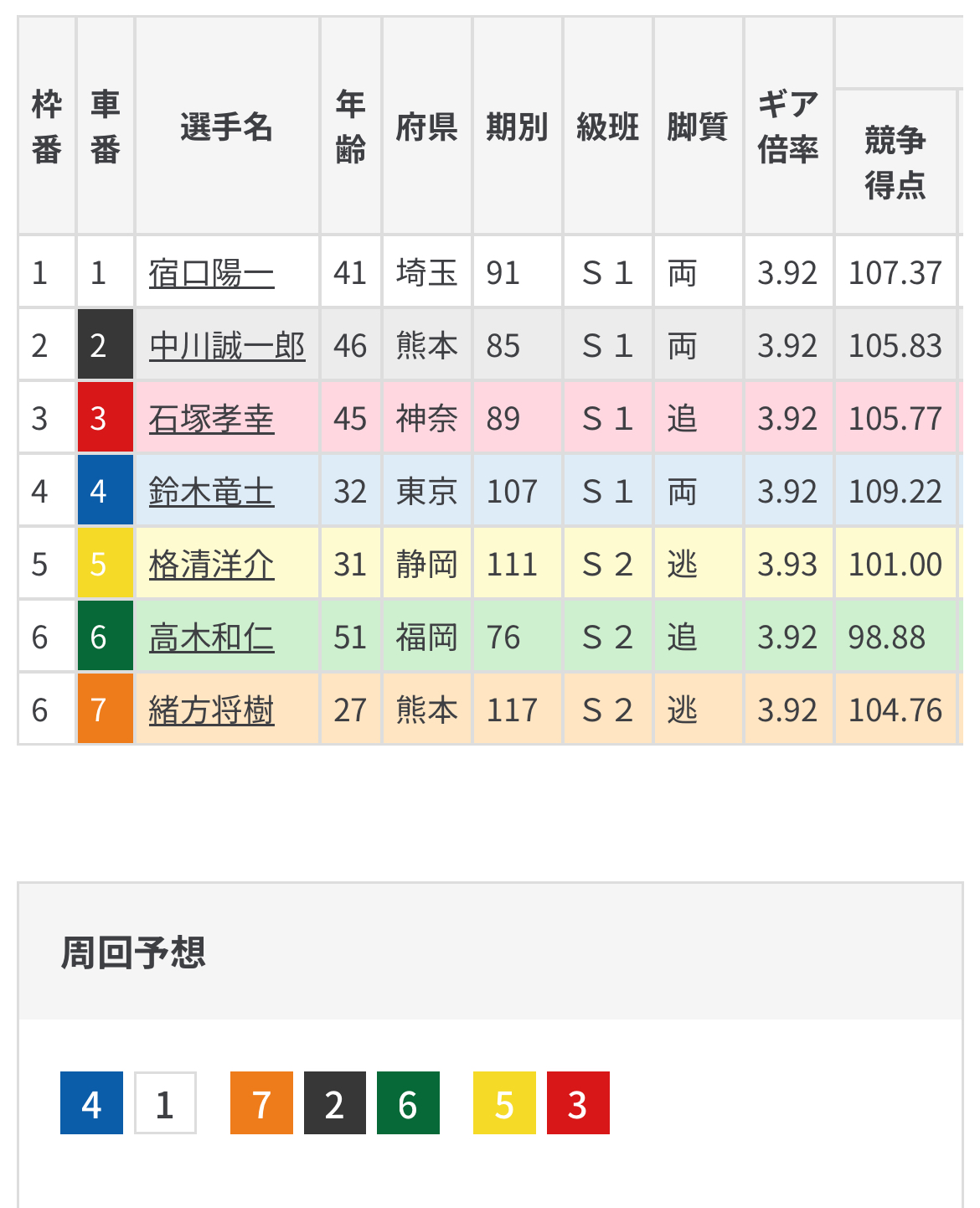 九州3車、唯一の3車ライン、後ろは中川それらを見積もっても緒方の先行に迷いなし。