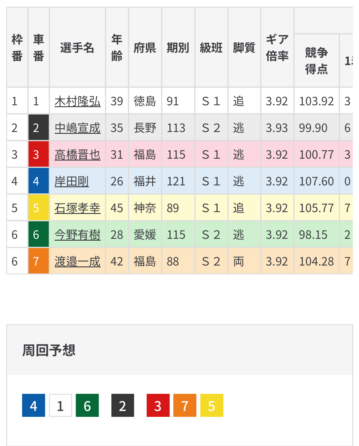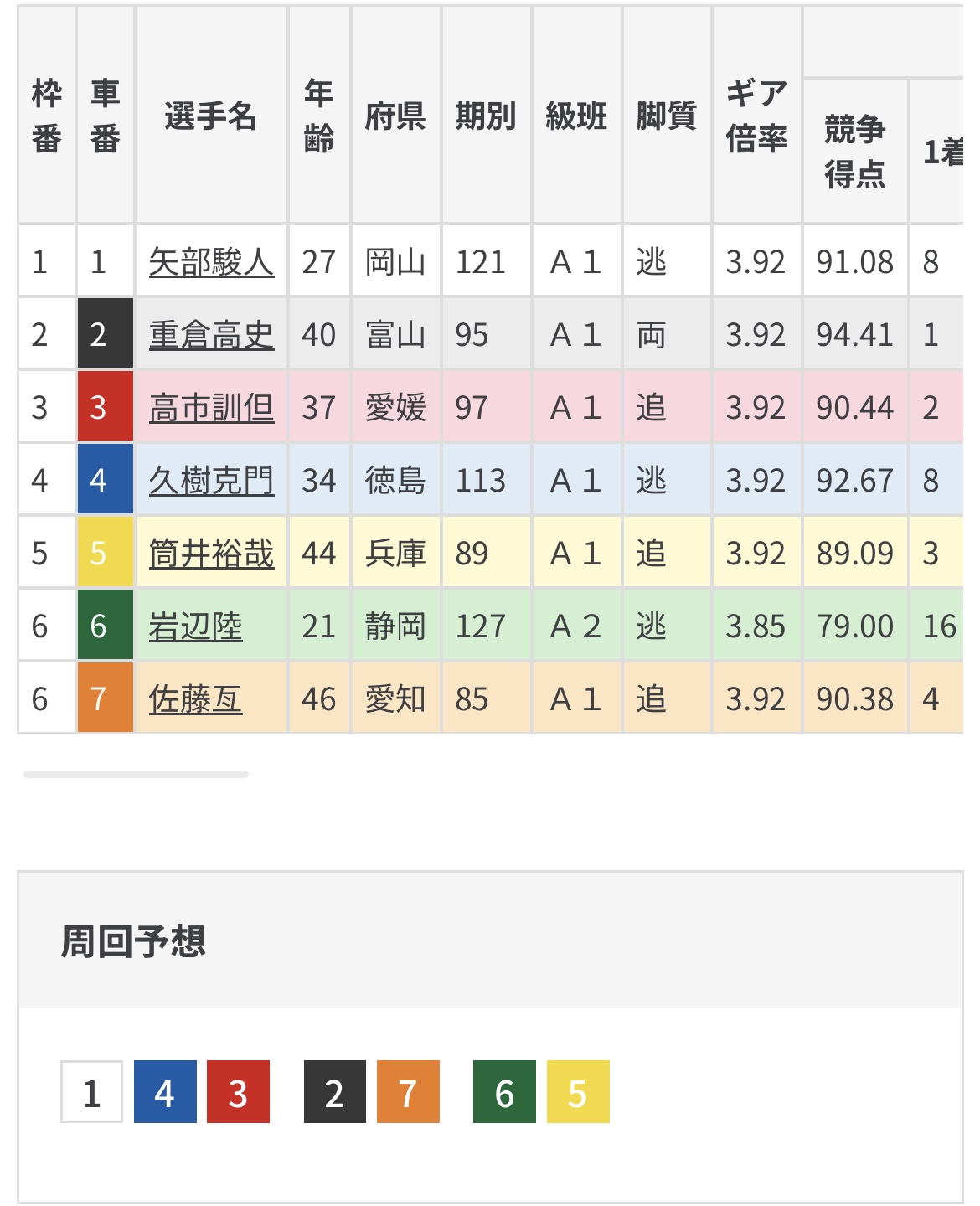 新鋭岩辺が人気も枠番悪く矢部の突っ張りでブーメランで6番手に下げされらることになりそう。