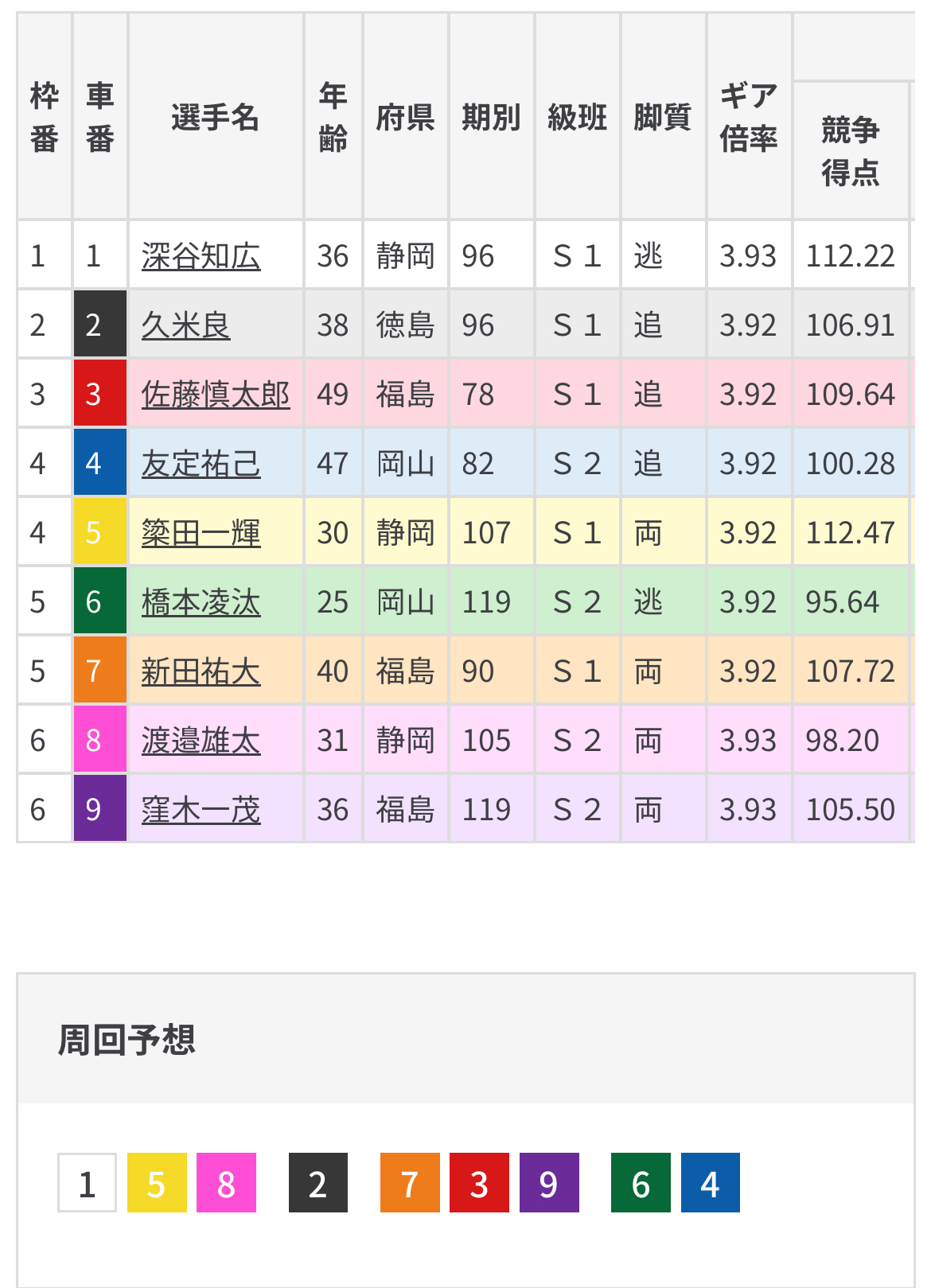 中団は新田となるも昨日格下野口の先行の3番手から全く動くことができずそれ以上の深谷の先行となればなおさら車の出は悪くなりそう。そうなれば再び新田の番手から慎太郎の強襲もありそう。