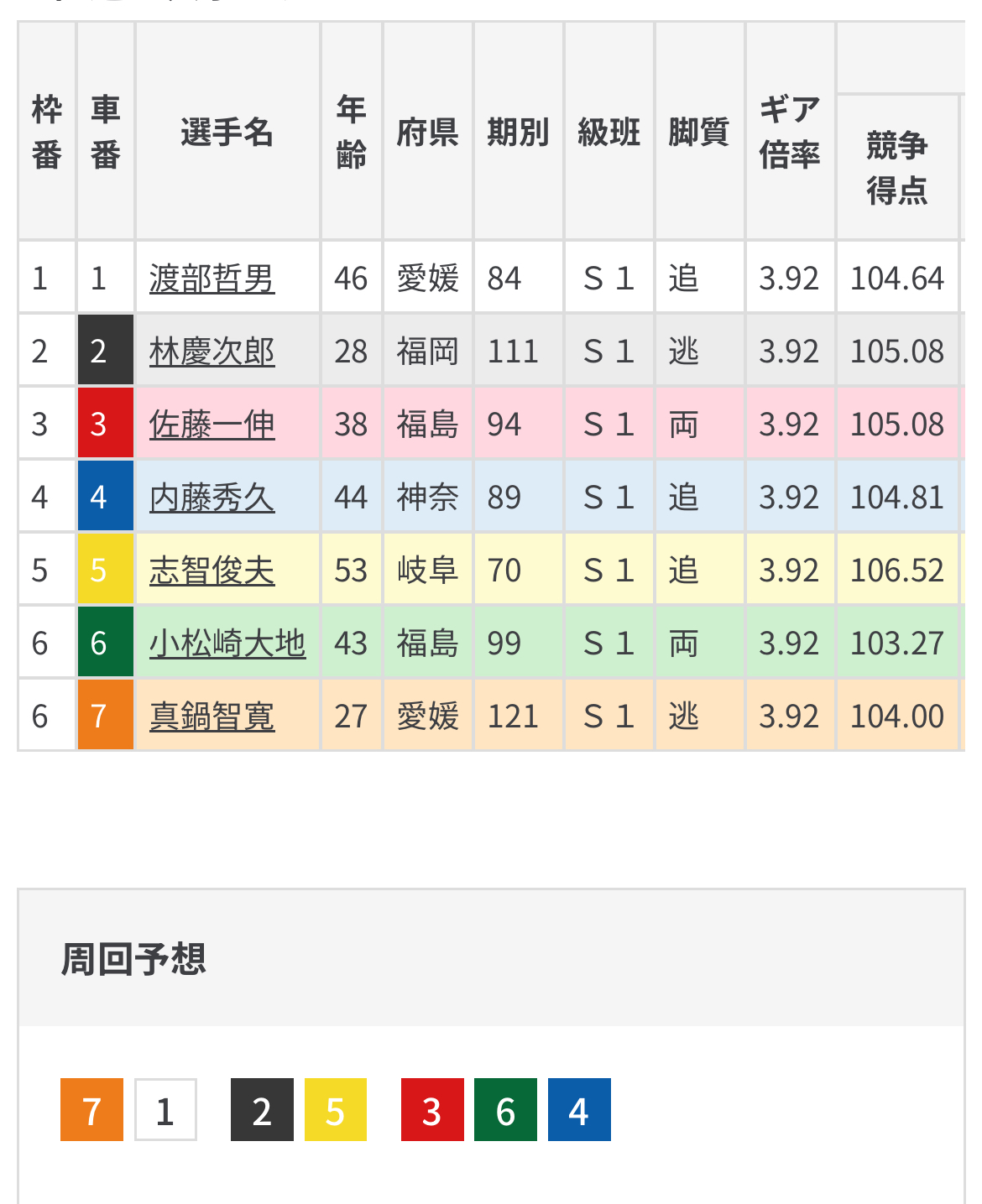 前回落車欠場の林もリハビリ先行となりそうも好枠生かした真鍋がそれを叩くことになりそうでその番手から渡部が抜け出すココを本線に。
