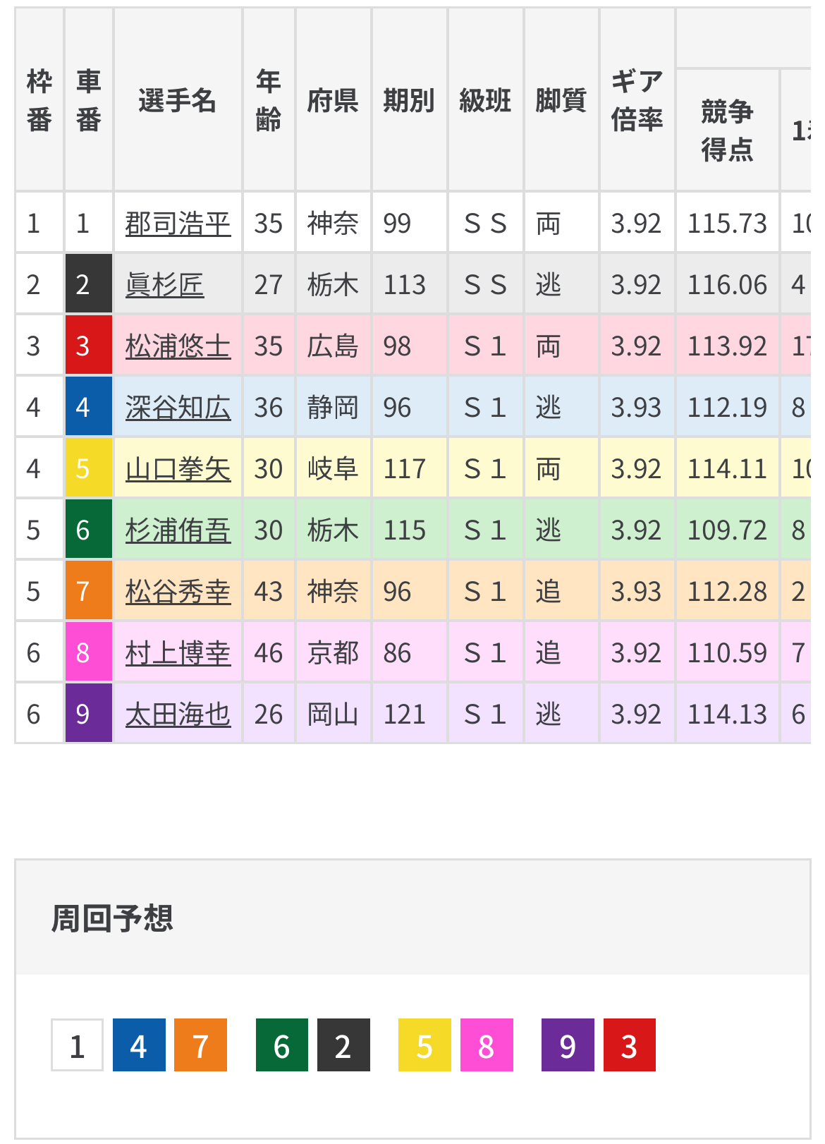 郡司は5番手から捲りで深谷を連れ込みたい所だが、連れ込みたい余り仕掛けが早くなると海也に併され、松浦の捌きで不発の可能性は高くなる。
