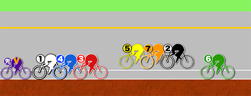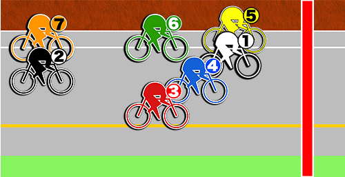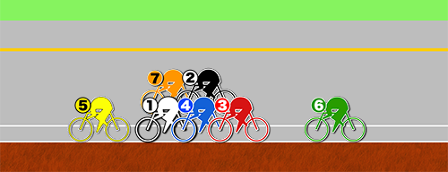 ❶才迫が前受けから❺磯島の仕掛けに合わせて踏んで番手に飛びつく展開を想定する。