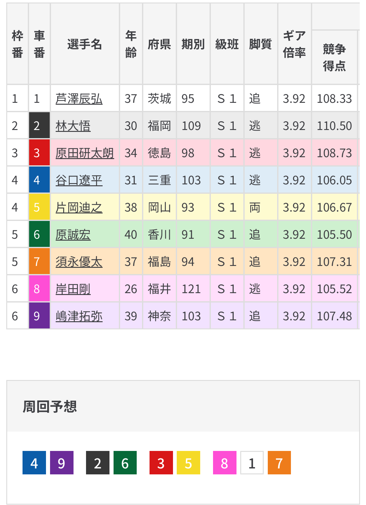 レースは岸田が好枠も得た事により、好機に迷いなく仕掛けて行くとみる。バンク特性も相成ってスピードに乗ってしまえば後続の巻き返しは厳しいだろう。