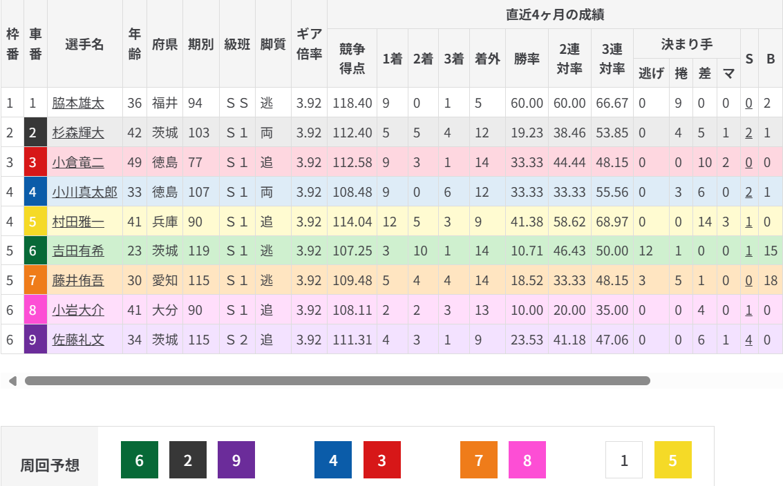 ここは車番通りに並ぶかはわからないが、おそらく中団でもつれるのを嫌う①脇本は最後方に。