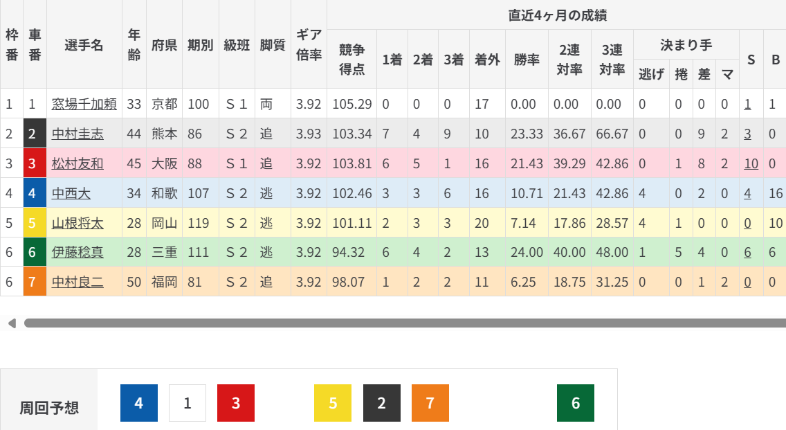 ここは昨日格下に捲られて①窓場と共に共倒れになってしまった④中西がもう一度奮起する。