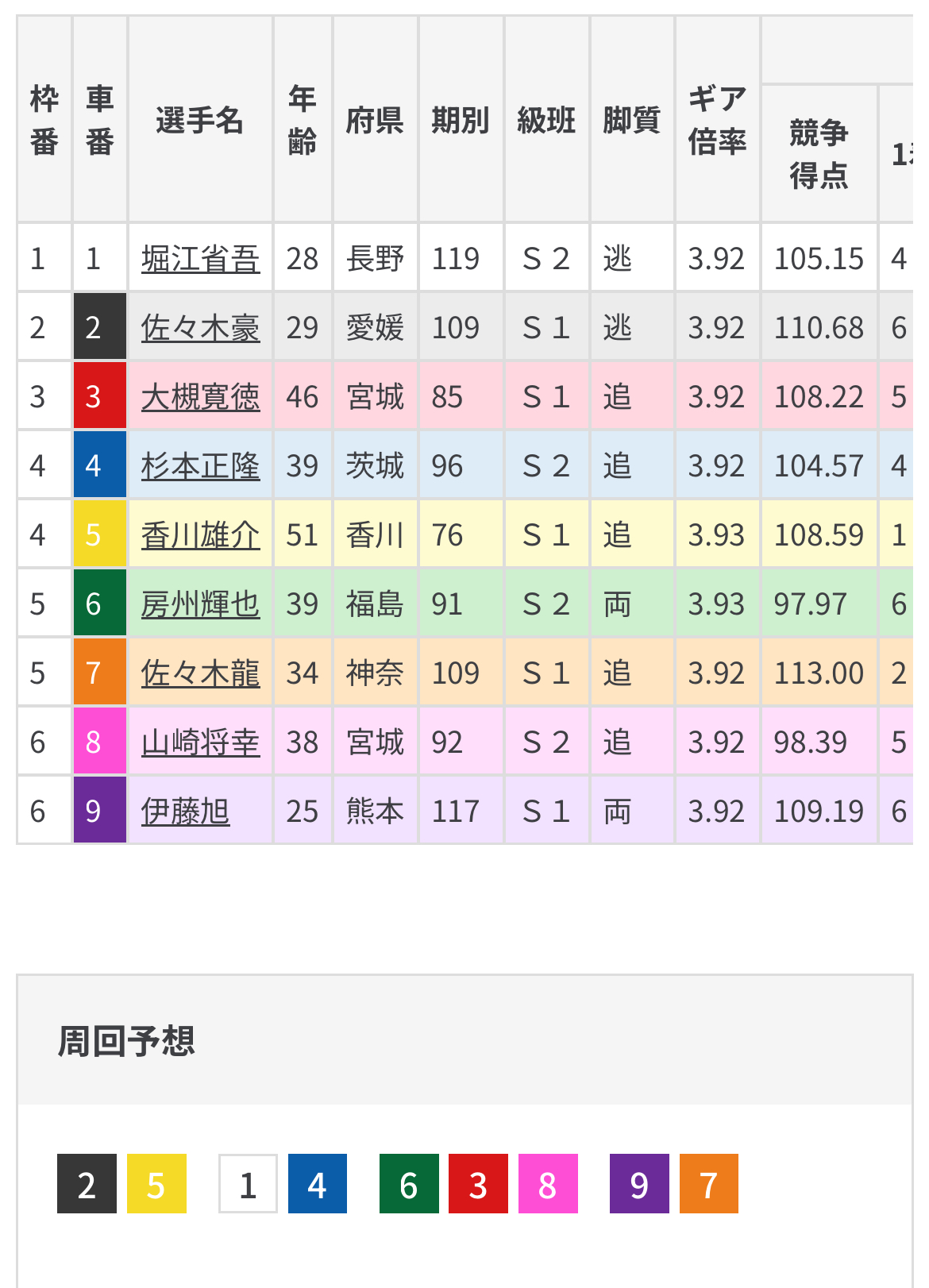 位置取って捲る伊藤旭とは戦法が被る佐々木豪になるが、後方にならないようにと先手ラインを追いかけながら伊藤旭より前で勝負できるかが焦点で堀江の気迫に圧倒されてしまえば仕掛けがワンテンポ遅れ香川と決めるのは難しいと判断してみる。