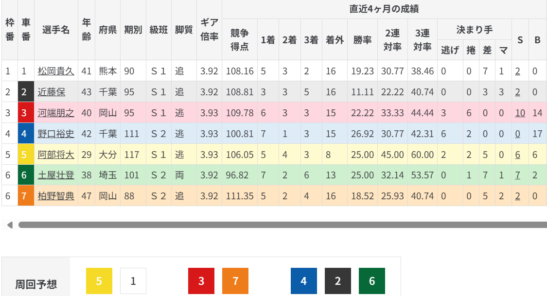 もし③河端が捲って⑦柏野が追走したとしても、③河端がG1で見せるような強烈な捲りが出るほど本調子じゃなさそうなので差せると見る。