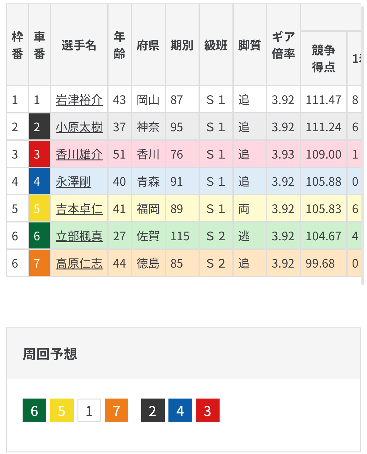 4対3の二分戦で先行一車の立部で後ろにタテある吉本
