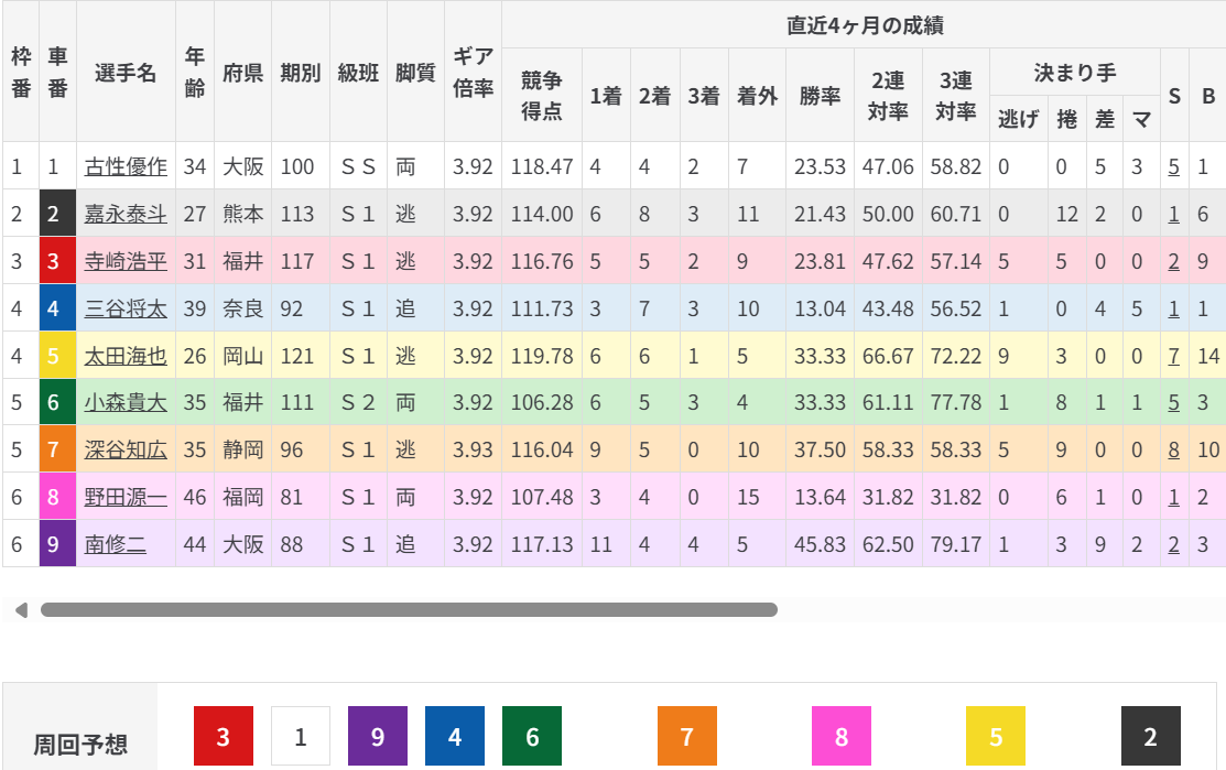③寺崎の突っ張り先行から①古性の番手捲り展開だが、今の①古性のトップスピードは単騎勢に負ける。